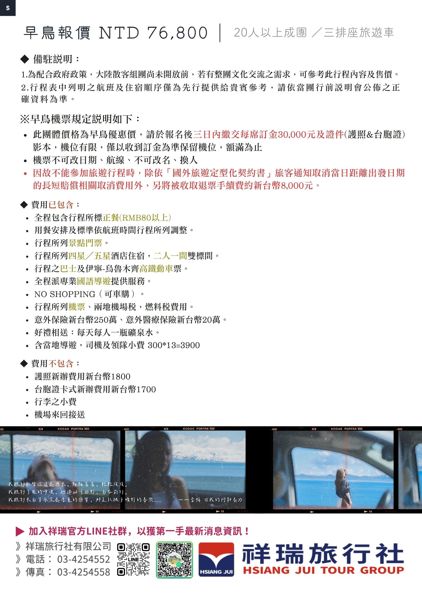 不含項目:行程表上未表明之各項開支、自選建議行程交通及應付費用、 純係私人之消費:如行李超重費、飲料酒類、洗衣、電話、電報及私人交通費;行李小費;至桃園機場接送費用