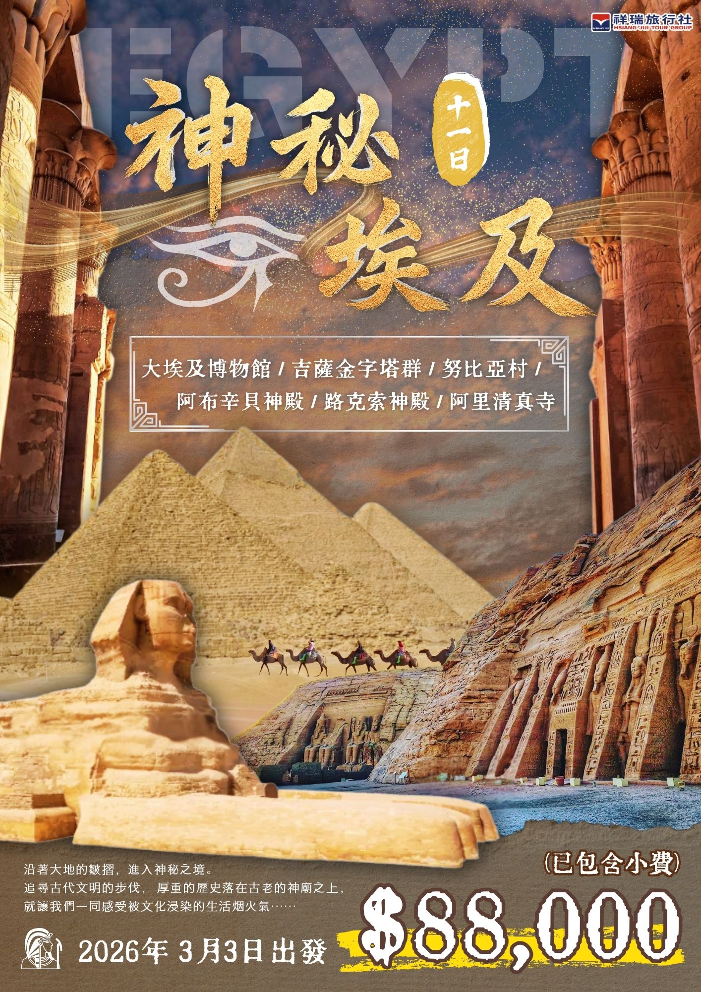 2026/03/10(二) | 桃園國際機場出發 🌍神秘埃及11日|🏛️大埃及博物館 🏜️金字塔 🏝️努比亞村 🛶阿布辛貝 🏯路克索 🕌阿里清真寺機位 26 候補0 已售0 可售6祥瑞自出~報名後7日內付訂,贈送金字塔旁騎乘駱駝體驗~ |