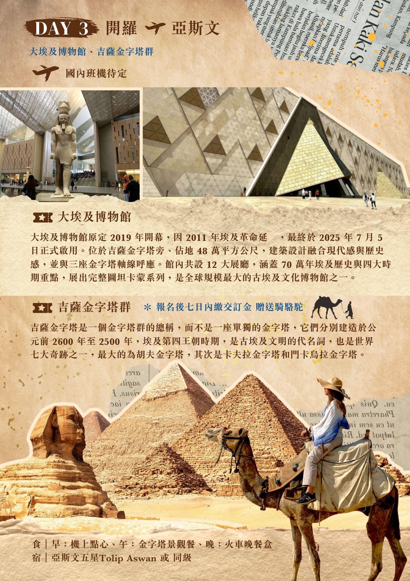2026/03/03(二) | 台北-松山機場出發 🌍神秘埃及11日|🏛️大埃及博物館 🏜️金字塔 🏝️努比亞村 🛶阿布辛貝 🏯路克索 🕌阿里清真寺機位 25 候補0 已售0 可售5祥瑞自出~報名後7日內付訂,贈送金字塔旁騎乘駱駝體驗~ |