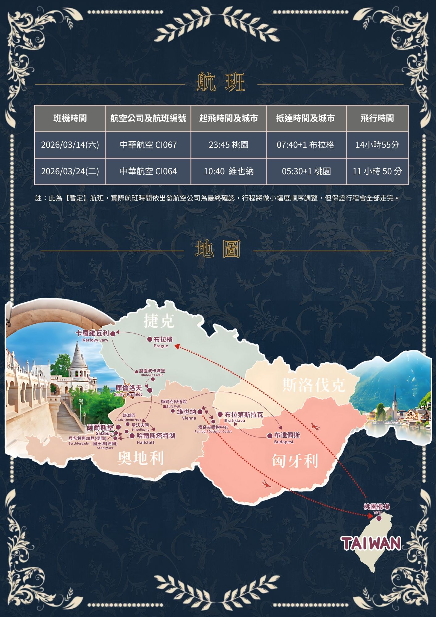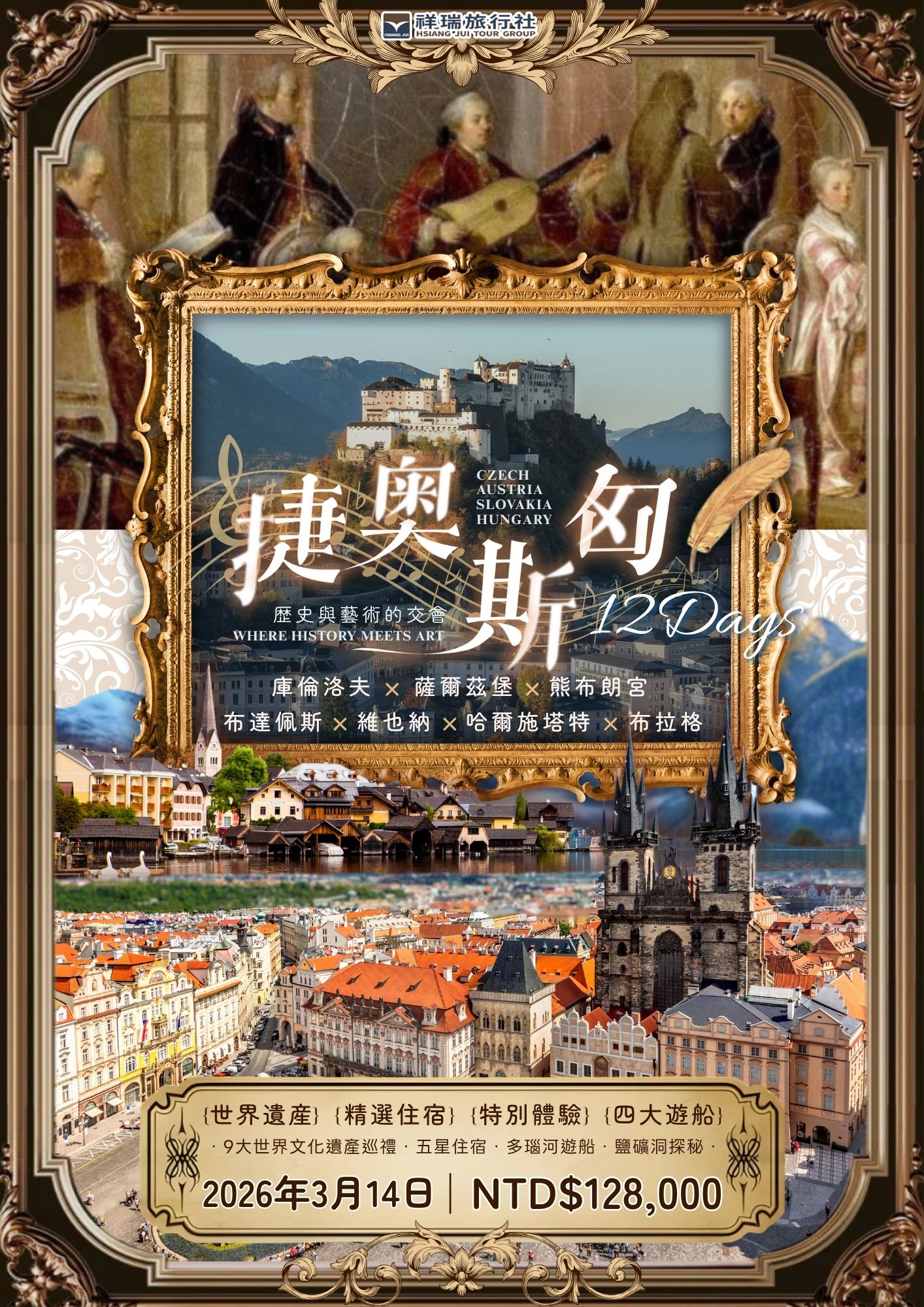 | 260314PR260314A2026/03/14(六) 12天 | 2026/03/14(六) | 桃園國際機場出發✨捷奧斯匈12日|歷史與藝術的交會|🏰庫倫洛夫×🎼薩爾茲堡×👑熊布朗宮×🌉布達佩斯×🏛布拉格×🏞️哈爾施塔特 機位 32 候補0 已售0 可售27祥瑞自出~早鳥優惠2025/10/31前兩人同行報名享優惠! | 桃園國際機場出發