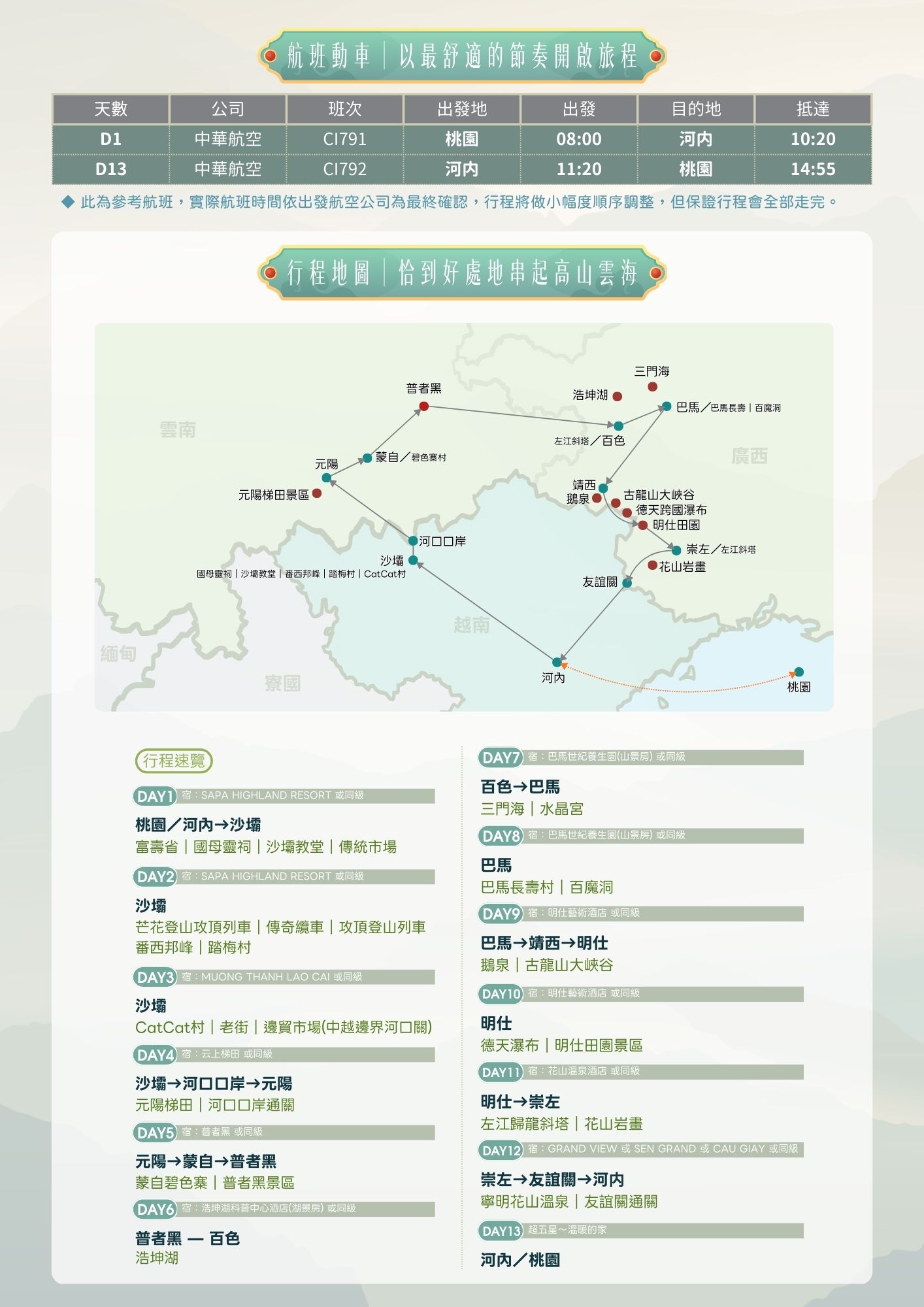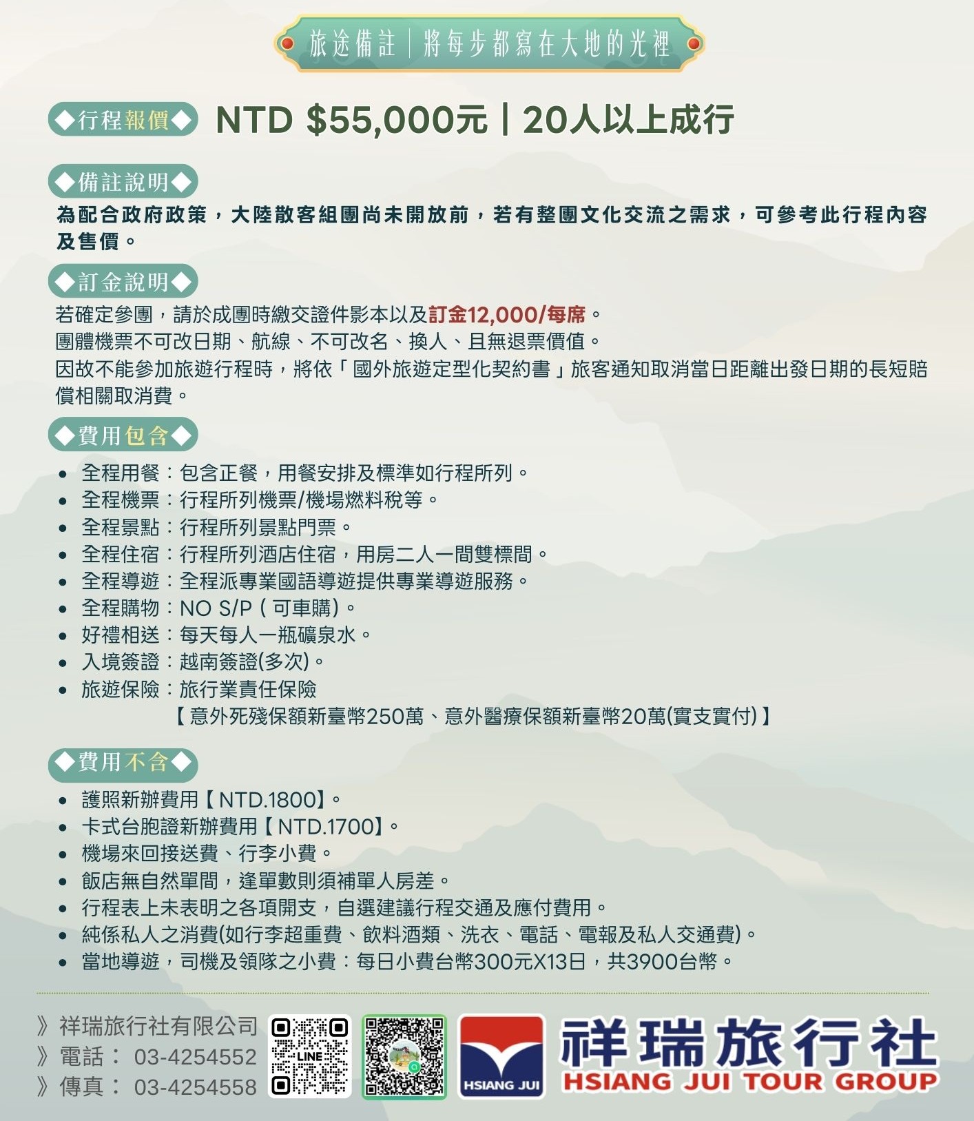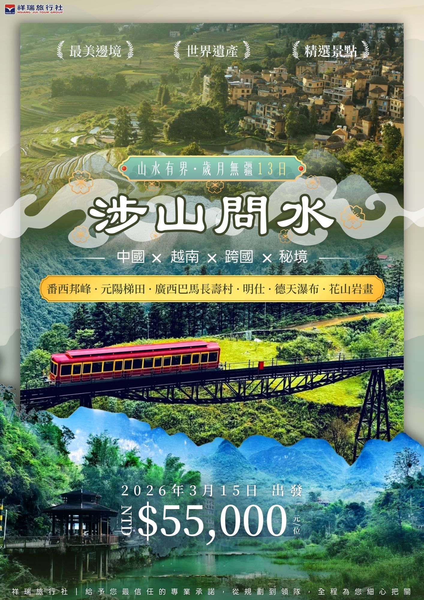 2026/03/15(日) | 桃園國際機場出發 🌏中國×越南|跨國秘境 ✨涉山問水:山水有界·歲月無疆13日 ✧ 番西邦峰·元陽梯田·巴馬長壽村·德天瀑布·花山岩畫機位 26 候補0 已售0 可售25🔹祥瑞精選自由行🔹~早鳥優惠~ |
