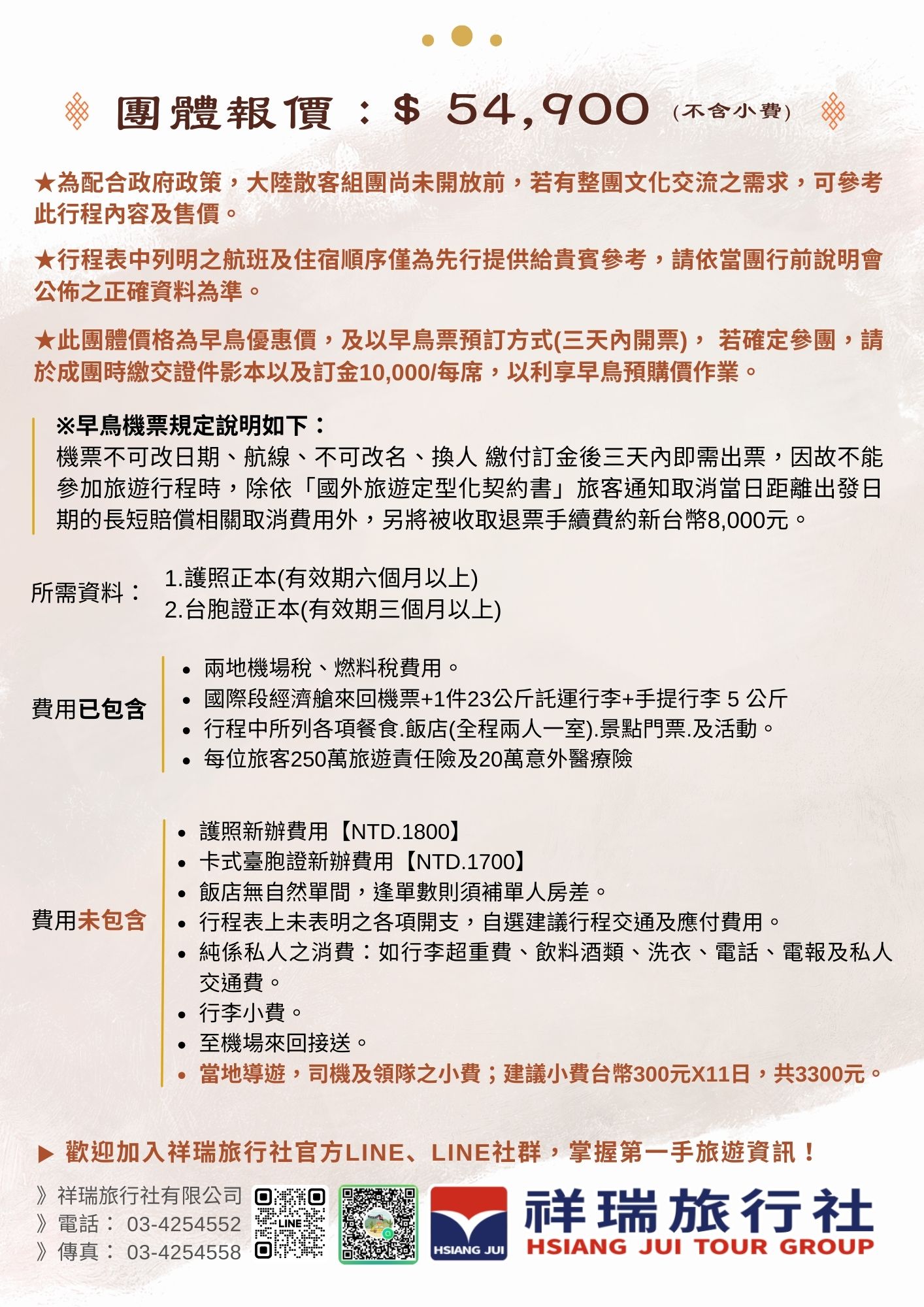 不含項目:不含當地導遊、司機和領隊小費(建議每日300元X11天共3300元)、至桃園機場接送、純係私人之消費:如行李超重費、飲料酒類、洗衣、電話、電報及私人交通費