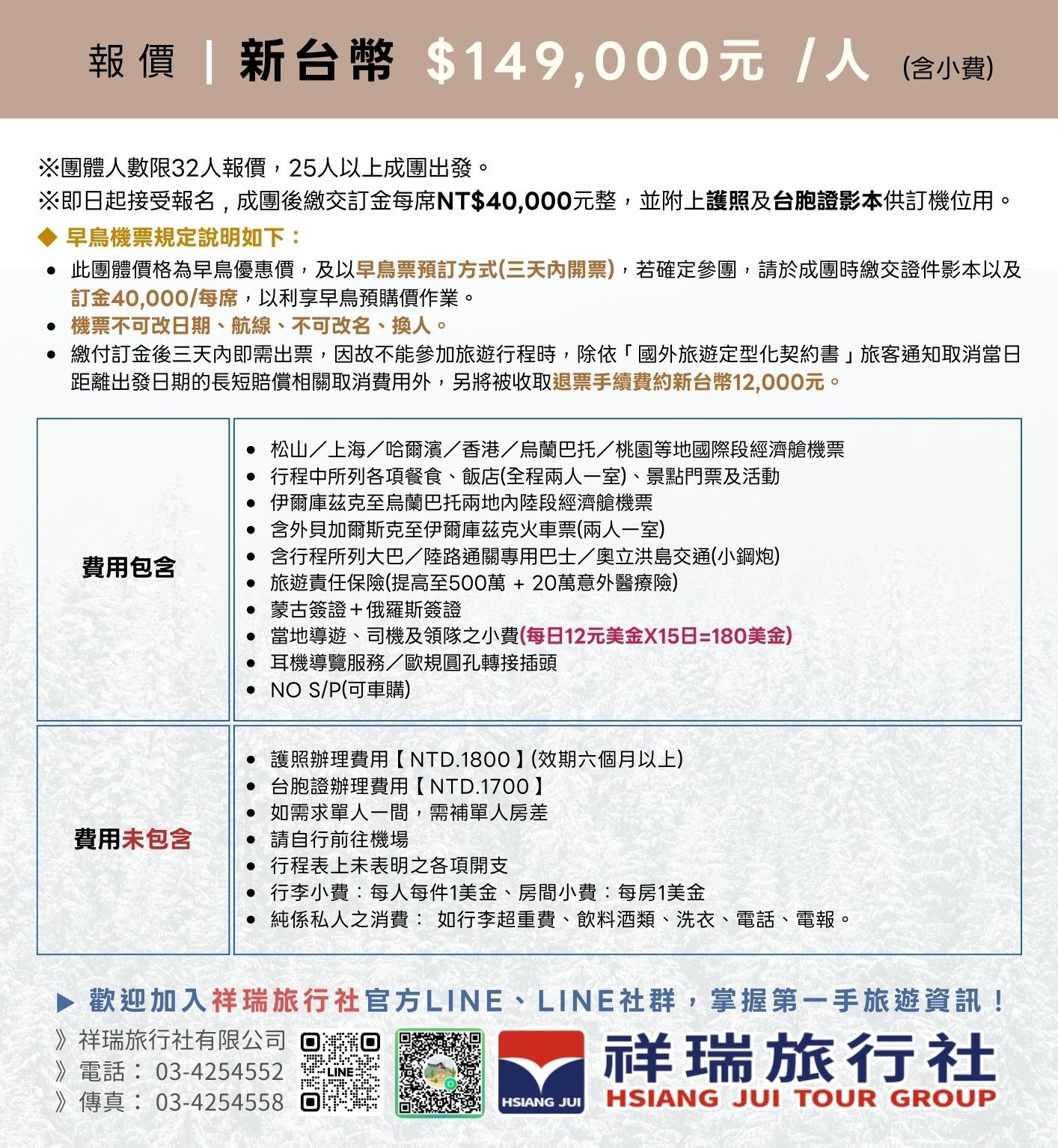 2026/06/17(三) | 台北-松山機場出發 🚆跨越歐亞的傳奇之旅|西伯利亞 × 蒙北雙境 15 日大鐵路探險~貝加爾湖・奧立洪島・特勒吉・烏蘭巴托・伊爾庫茲克✨機位 26 候補0 已售0 可售0~祥瑞精選自由行/早鳥優惠~ |
