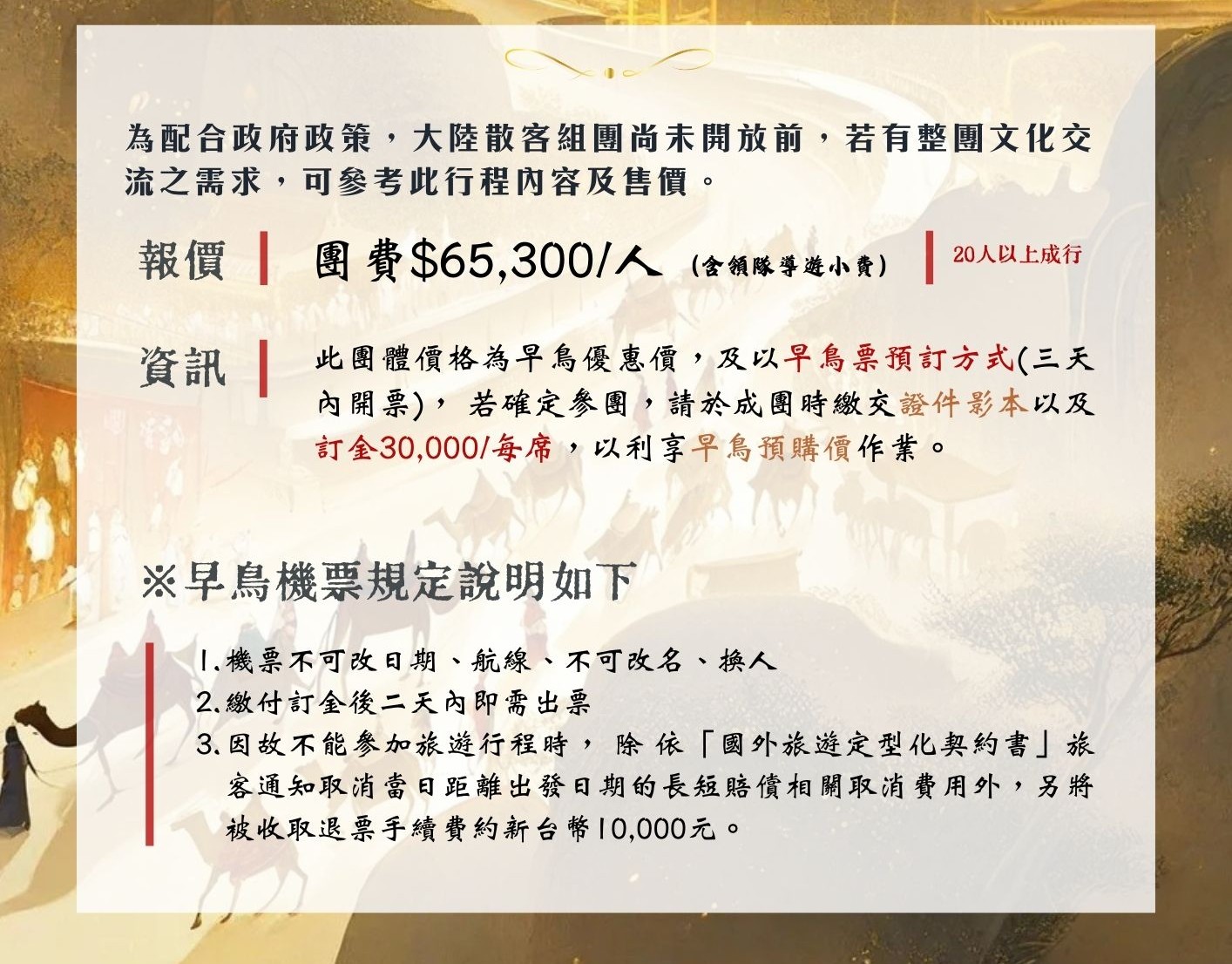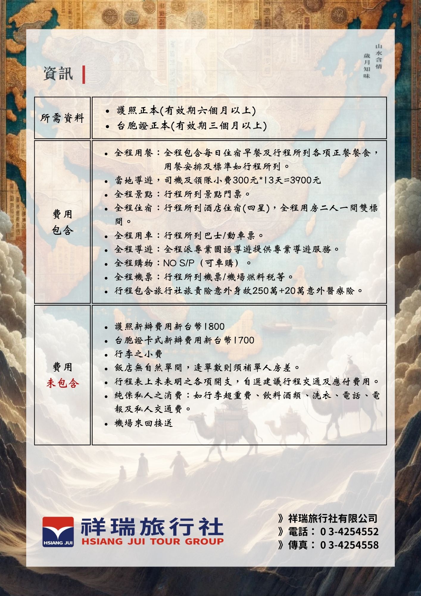 不含項目: 行程表上未表明之各項開支、自選建議行程交通及應付費用、 純係私人之消費:如行李超重費、飲料酒類、洗衣、電話、電報及私人交通費、 行李小費、至桃園或松山機場接送費用